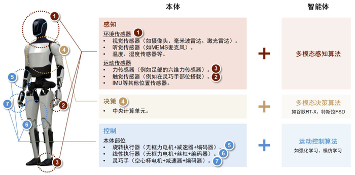 与智能汽车类似,具身智能的实现包括“感知、决策、控制”三个主要环节,并需要内外部通信传输的支持。