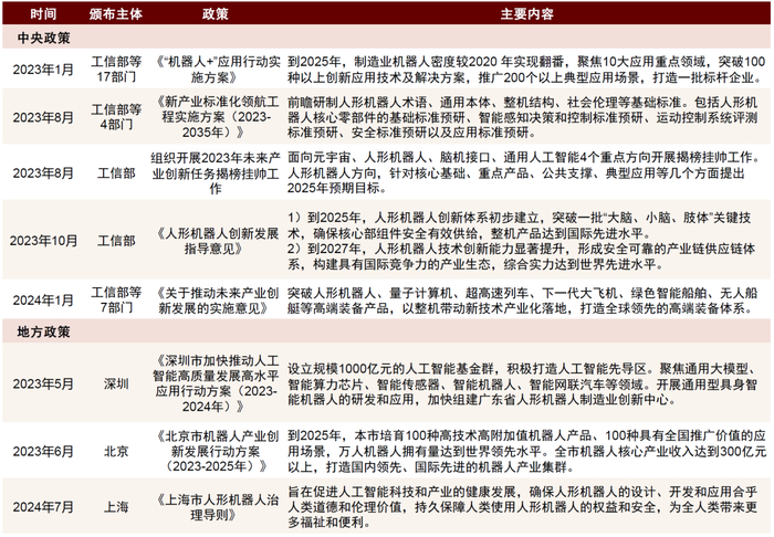 全球各国政府均将发展人形机器人定位于国家战略。我们认为,人形机器人本身集精密制造、运动控制、感知决策等高技术于一体,又可在科研、工业、服务、特种等多场景落地,长期看亦有望缓解领先经济体老龄化压力及较高的生产生活成本,因而受到主要经济体的重视。全球各国纷纷通过完善制度建设、提供资金补贴等方式推动行业发展。