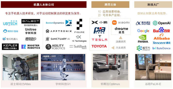众多科技厂商涌入人形机器人的竞争角逐中。英伟达CEO黄仁勋曾在ITF World 2023半导体大会上表示“人工智能下一个浪潮是具身智能,即能理解、推理并与物理世界互动的智能系统”[3],鉴于人形机器人较高的技术壁垒以及广阔的应用前景,我们认为具身智能已被业内视为人工智能的下一个“必争之地”。行业竞争不仅限于机器人初创公司,汽车、消费等行业的跨界主体亦凭借自身在技术、市场方面的基础,加入人形机器人的竞争之中。