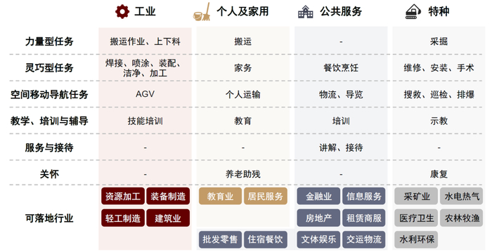 大部分行业都是由多类元任务组合而成的,向终局去看,我们认为人形机器人有望在各个行业找到适合自身落地的应用场景。比如,服务业前台(营业部客户接待)、采矿业(物料挖掘搬运)、水电热气(电力巡检)、看护养老业(康养陪护)、装备制造业(工业制造)、医疗卫生业(手术机器人)、住宿和餐饮业(餐饮服务机器人)等等,不一而足。