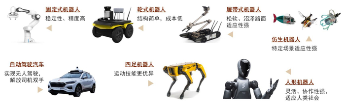 具身智能本体包括众多形态,人形机器人或打开更大的想象空间。具身智能的本体形态十分丰富,包括四足、轮式、履带式、人形等,甚至智能汽车亦可称为具身智能的典型形态之一。我们认为,人类社会的诸多工具与设施是参照人类的尺度去设计、运行的,具身智能设计成人类形态有望更好地适应人类社会的各种任务与场景,全面复用基础设施,人形机器人有望打开更大的想象空间。本报告后续内容将重点围绕人形机器人展开叙述。