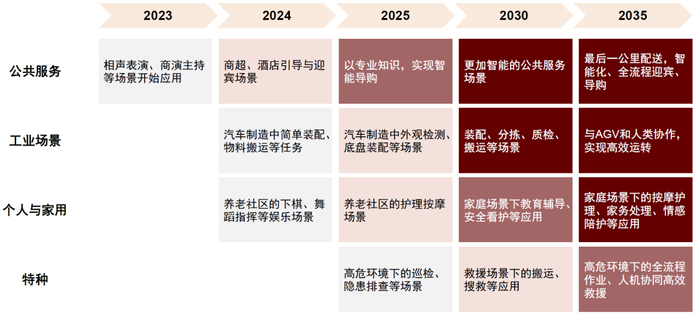 由专用场景向通用场景渐次渗透,逐步向终局场景迈进。我们认为人形机器人的渗透不会一蹴而就,正如当前业内所尝试的应用场景,诸如工业制造、商演主持、接待导览、电力巡检等,均是属于“交互性较弱、标准化较高”的专用场景。随着技术的不断成熟,我们认为人形机器人不仅能够有更自然的交互性能,实现在交互要求更高的公共服务场景以及个人家用场景中的应用;还能提升对复杂场景的应对能力,进而开启在高危、救援、多变环境下的渗透。总体趋势是由专用场景向通用场景渐次渗透,最终实现在全行业各场景的落地。