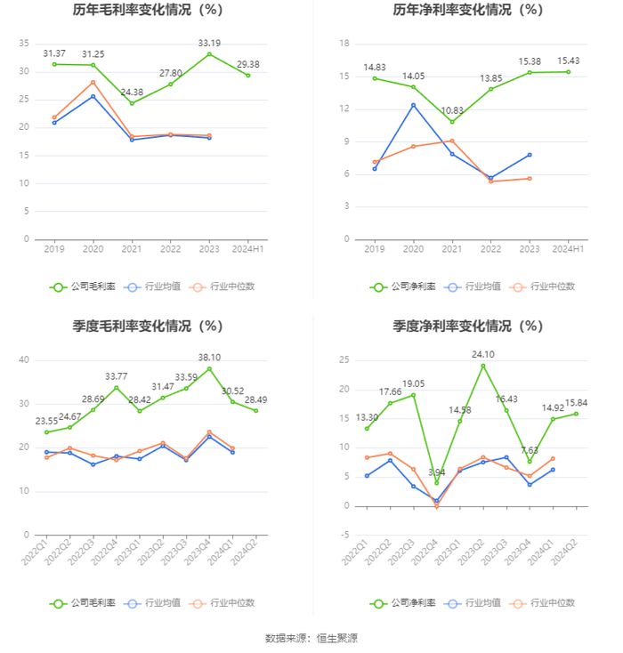 2024年上半年,公司毛利率为29.38%,同比下降0.62个百分点;净利率为15.43%,较上年同期下降4.08个百分点。从单季度指标来看,2024年第二季度公司毛利率为28.49%,同比下降2.98个百分点,环比下降2.03个百分点;净利率为15.84%,较上年同期下降8.26个百分点,较上一季度上升0.92个百分点。