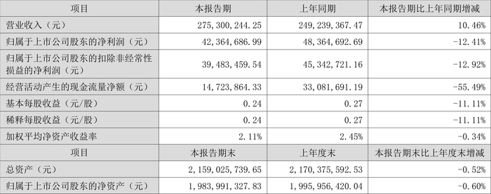 中证智能财讯 宏达高科(002144)8月28日披露2024年半年度报告。2024年上半年,公司实现营业收入2.75亿元,同比增长10.46%;归母净利润4236.47万元,同比下降12.41%;扣非净利润3948.35万元,同比下降12.92%;经营活动产生的现金流量净额为1472.39万元,同比下降55.49%;报告期内,宏达高科基本每股收益为0.24元,加权平均净资产收益率为2.11%。