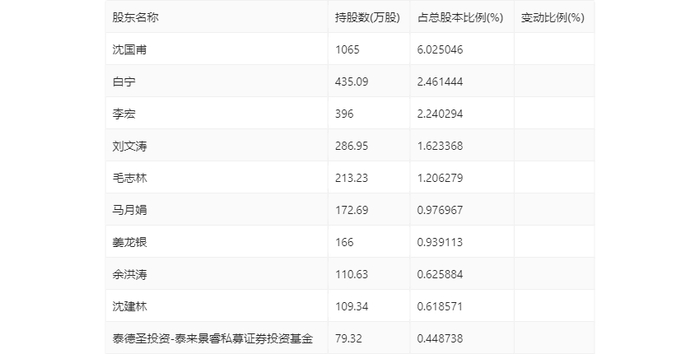 半年报显示,2024年上半年末公司十大流通股东中,新进股东为泰德圣投资-泰来景睿私募证券投资基金,取代了一季度末的BARCLAYS BANK PLC。在具体持股比例上,余洪涛持股有所上升,姜龙银、沈建林持股有所下降。