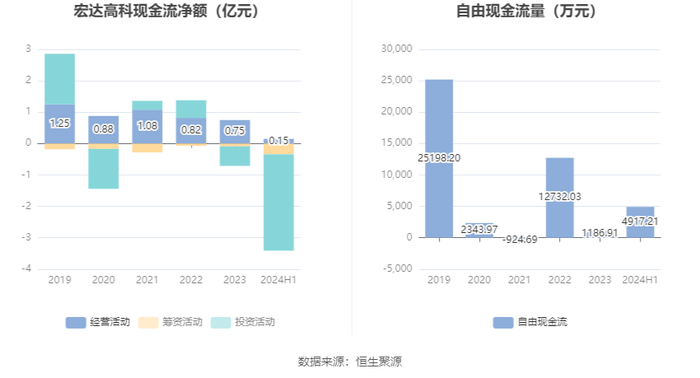 2024年上半年,公司经营活动现金流净额为1472.39万元,同比下降55.49%;筹资活动现金流净额-3428.34万元,同比减少6835.51万元;投资活动现金流净额-3.07亿元,上年同期为-273.67万元。