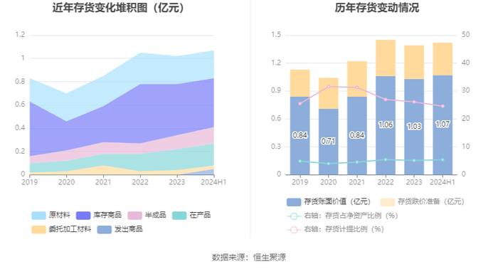 从存货变动来看,截至2024年上半年末,公司存货账面价值为1.07亿元,占净资产的5.38%,较上年末增加418.63万元。其中,存货跌价准备为3477.0万元,计提比例为24.58%。