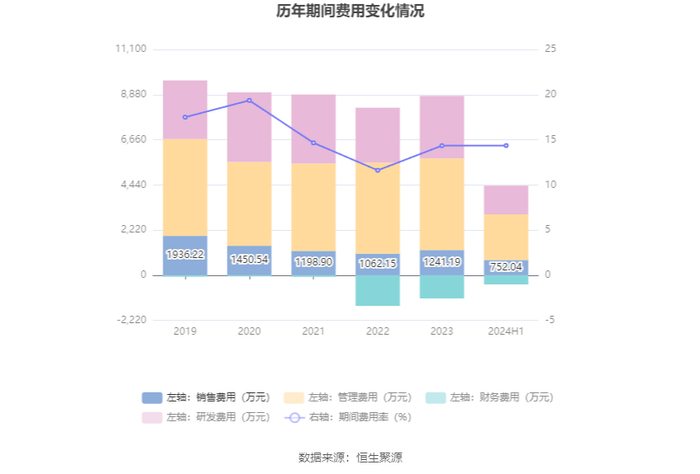 2024年上半年,公司期间费用为3953.31万元,较上年同期增加489.41万元;期间费用率为14.36%,较上年同期上升0.46个百分点。其中,销售费用同比增长25.4%,管理费用同比下降1.97%,研发费用同比增长5.48%,财务费用由去年同期的-759.43万元变为-450.65万元。