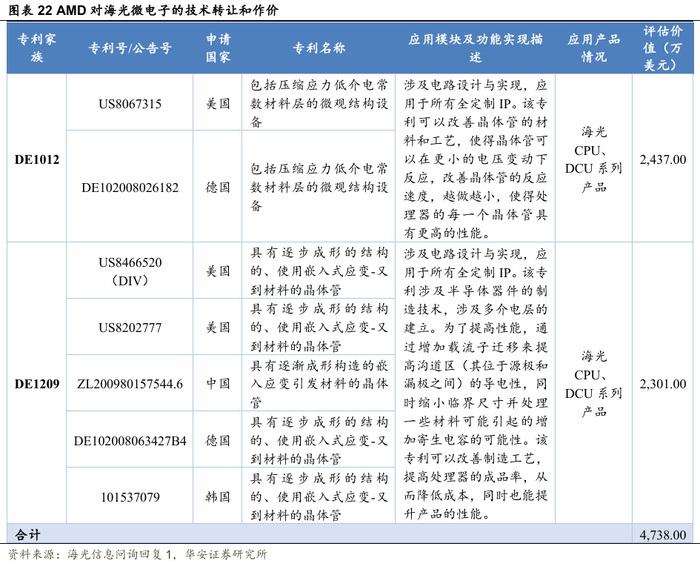 海光信息和AMD共同设立海光集成、海光微电子。AMD对海光微电子出资7项专利作价4,683.6735万美元作为AMD对海光微电子的出资。