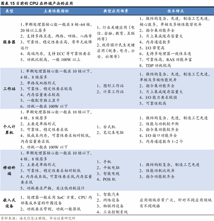 CPU可以应用在服务器、工作站、个人计算机(台式机、笔记本电脑)、移动终端和嵌入式设备等不同设备上,根据应用领域的不同,其架构、功能、性能、可靠性、能效比等技术指标也存在一定差异。