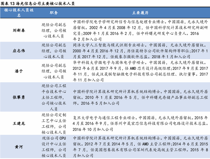 公司核心技术团队具备丰富的半导体行业从业经验。公司多名核心技术人员来自国际大厂/中科曙光研发中心,具备丰富的研发设计经验。其中刘新春现任公司副总经理,公司核心技术人员,曾于2009年1月至2016年2月,任中科曙光研发中心负责人。潘于曾于2012年6月至2017年9月,任AMD芯片设计高级经理,现任公司副总经理,公司核心技术人员。