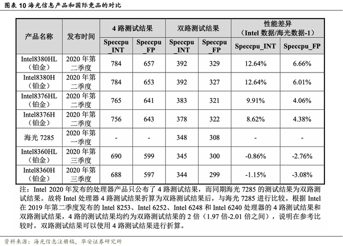 公司通过综合比较处理器市场定位、核心数量、产品售价等因素,选取了Intel在2020年(与海光7285同期)发布的6款至强铂金系列产品(能够反映Intel2020年发布的主流CPU产品的性能水平),与海光7285进行性能对比(采用业界国际通用的测试程序SPECCPU2017测试数据)