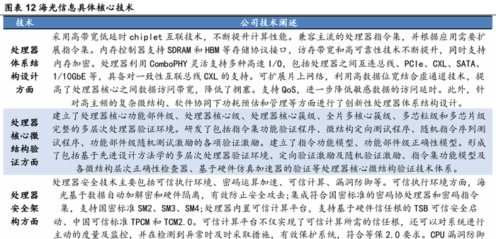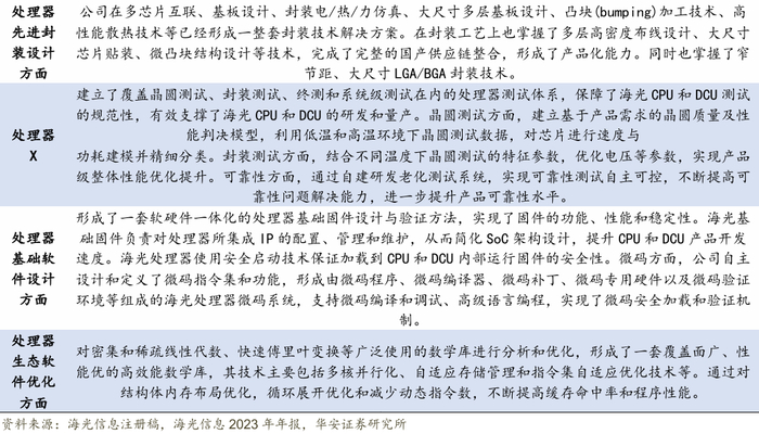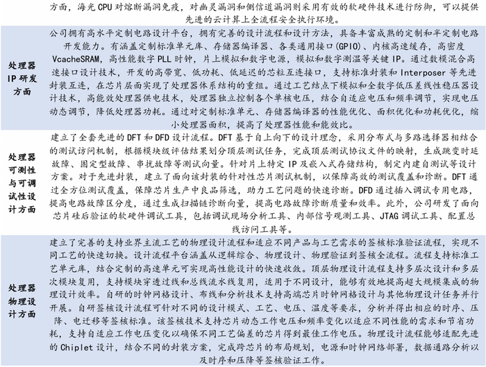 公司在CPU和DCU芯片技术领域持续投入,公司在处理器体系结构设计、处理器核心微结构验证、处理器安全架构、处理器IP研发、处理器可测性与可调试性设计、处理器物理设计、处理器先进封装设计、处理器测试、处理器基础软件设计和处理器生态软件优化等核心技术上持续开展研发,优化、提升公司产品性能。