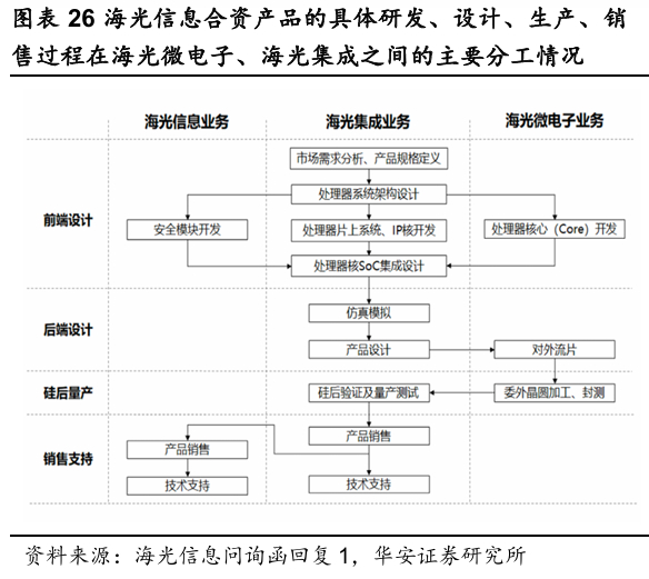 根据许可协议,合资产品研发阶段,海光集成负责分析市场需求、定义产品规格,海光微电子负责处理器核的开发;设计阶段,海光集成主要负责测试及物理设计;生产阶段,海光微电子负责流片,外协生产、封装及测试;销售阶段,海光集成负责对外销售合资产品并提供相应的技术支持。