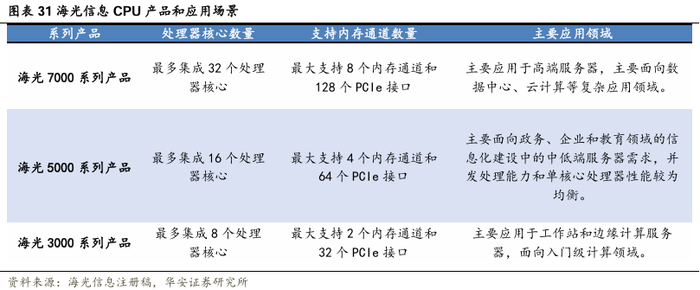 从海光CPU应用场景角度看,公司将海光CPU产品规划为海光7000系列、海光5000系列和海光3000系列。三个系列产品技术设计同源,处理器核心等具有相似的技术特征。