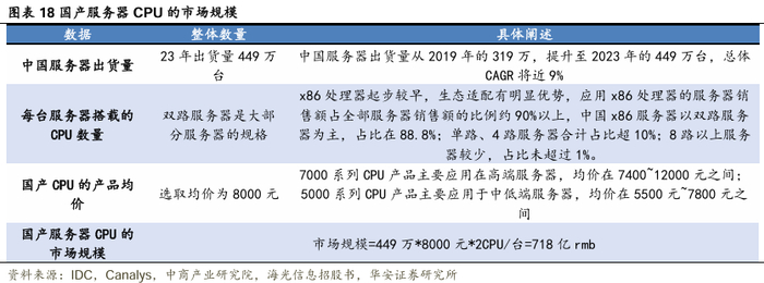 国产服务器和PC的 CPU的市场空间广阔。其中服务器CPU市场看,根据IDC的数据显示,中国服务器出货量从2019年的319万,提升至2023年的449万台,总体CAGR将近9%。从每台服务器搭载的CPU数量看,x86处理器起步较早,生态适配有明显优势,应用x86处理器的服务器销售额占全部服务器销售额的比例约90%以上,中国x86服务器以双路服务器为主,占比在88.8%;单路、4路服务器合计占比超10%;8路以上服务器较少,占比未超过1%。则假设服务器以双路为主要形态。从CPU的产品均价看,7000系列CPU产品主要应用在高端服务器,均价在7400~12000元之间;5000系列CPU产品主要应用于中低端服务器,均价在5500元~7800元之间。以此推算国产服务求CPU的市场规模以2023年的出后量449万台,均价8000元/CPU,一台CPU搭载2台CPU,总体市场空间718亿元rmb。