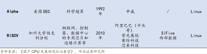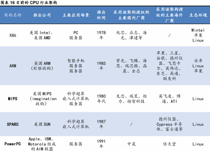 多年来,多家RISC架构提出企图颠覆x86,目前主流RISC架构主要是ARM和RISC-V。CISCCPU(复杂指令集)的代表是x86,由于采取向前兼容的设计策略,指令功能复杂,种类繁多,芯片内部设计也相对复杂。由于采用了非常严格的授权策略,该架构全球主流公司只有Intel和AMD两家,国内由于历史原因得到授权的厂商有兆芯、澜起、海光等。RISC类CPU精简了CISC许多“古老的”和使用频率较低的指令,指令集功能单纯,CPU内部构造也得到了简化,适合高速操作。采用RISC指令集的架构包括ARM、MIPS、RISC-V、SPARC、PowerPC、Alpha等。但除ARM外,其他架构通常只应用在特殊场景,并没有打开开放市场。近年来,RISC-V在IoT领域发展迅速,有望取代ARM部分份额。国内采用ARM架构的主要厂商有海思、紫光展锐、瑞芯微等,具有RISC-V相关产品研发经验的有北京君正、阿里平头哥、东软载波、芯来科技和SiFive等。