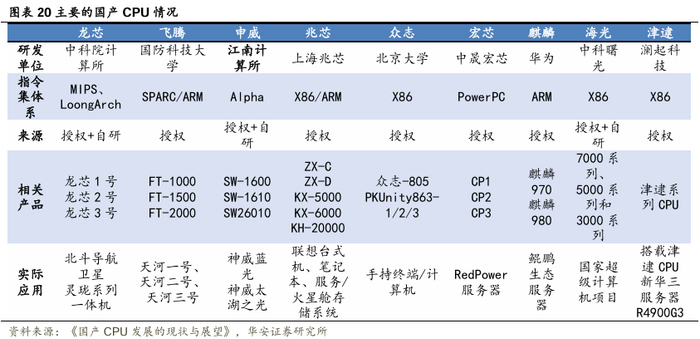 国产ARM架构主流厂商包括飞腾和华为。飞腾采用SPARC/ARM架构,可应用于政府办公、互联网、电信、金融税务等信息化系统,系列产品有FT1000、FT1500、FT2000等,FT系列CPU定位高性能服务器,成功应用于我国天河一号、二号和三号高性能计算机;华为海思以鲲鹏系列芯片为基础,打造了鲲鹏生态产业联盟,其服务器性能比肩国际主流大厂,而PC端的芯片也完成了与多家国产操作系统的适配,成为国内出货量最高的自主可控CPU之一。