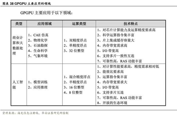 随着GPGPU的技术发展和相关生态环境的逐步完善,其用途被进一步发掘。目前,GPGPU已经广泛用于商业计算和大数据处理,如天气预报、工业设计、基因工程、药物发现、金融工程等。在人工智能领域,使用GPGPU在云端运行模型训练算法,可以显著缩短海量训练数据的训练时长,减少能源消耗,从而进一步降低人工智能的应用成本。与此同时,GPGPU能够提供完善的软件生态系统,便于各种已有应用程序的移植和新算法的开发,因此全球人工智能相关处理器解决方案仍然是以GPGPU为主。因此,GPGPU是人工智能领域最主要的协处理器解决方案,占据人工智能90%以上的市场份额,在智能工厂、无人驾驶、智慧城市等领域具有广泛的市场空间。