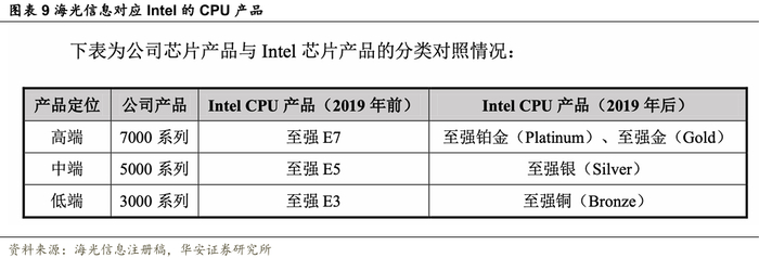 由于Intel公司的处理器产品在市场上处于主导地位,因此公司对标Intel公司区分产品定位。公司把面向关键任务和数据中心关键应用的7000系列芯片称为高端芯片,把面向边缘计算服务器、工作站应用的3000系列芯片称为低端或工作站芯片,把面向其他中端或中低端应用场景的5000系列芯片称为中端芯片。