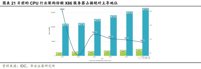 具体来看,2022年全球x86服务器的销售额为1109.55亿美元,同比增长18.8%。相比之下非x86服务器的销售额同比大涨32.8%至122.69亿美元。2023年全球服务器市场增长放缓,x86服务器的销售额同比仅增长了2.3%至1109.55亿美元,不过非x86服务器的销售额仍保持了高达22.1%的同比增长,达到了149.84亿美元。根据IDC的预计,到2027年,x86服务器的销售额增长至1655.68亿美元,非x86服务器的销售额也将增长至235.71亿美元。从整体的趋势来看,未来数年内,虽然非x86服务器保持了持续的高速增长,但是x86服务器仍然是整个服务器市场的主流,以销售计算的占比将持续维持在87.5%以上。即使到2027年,非x86服务器的市场份额仍然只有不到12.5%,相比2023年的11.66%,仅增长了1个百分点不到。