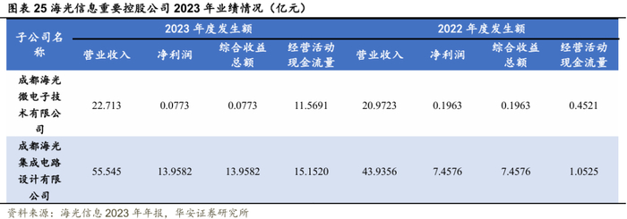 公司主要控股公司成都海光微电子技术有限公司2023年实现营业收入22.713亿元,同比2022年的20.9722亿元小幅增长8.3%。成都海光集成电路设计有限公司实现营业收入55.545亿元,同比2022年43.9355亿元增长26.4%。