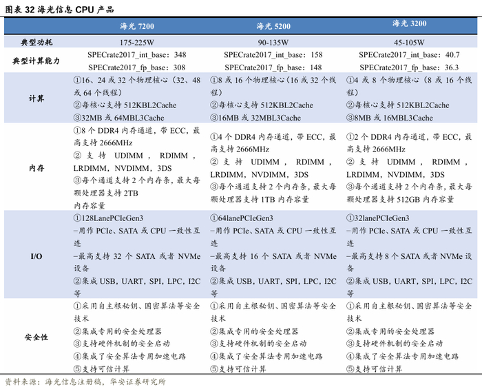 海光CPU主要面向复杂逻辑计算、多任务调度等通用处理器应用场景需求,兼容国际主流x86处理器架构和技术路线,具有优异的系统架构、高可靠性和高安全性、丰富的软硬件生态等优势。海光CPU按照代际进行升级迭代,每代际产品按照不同应用场景对高端处理器计算性能、功能、功耗等技术指标的要求,细分为海光7000系列产品、海光5000系列产品、海光3000系列产品。