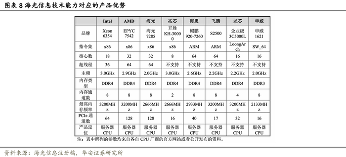 公司在国内率先完成了高端通用处理器和协处理器产品成功流片,并实现了商业化应用。公司产品性能达到了国际上同类型主流高端处理器的水平,在国内处于领先地位。除了海光CPU之外,国外主流的CPU厂商主要有Intel、AMD;国内CPU厂商主要有海思、龙芯、兆芯、飞腾、申威。
