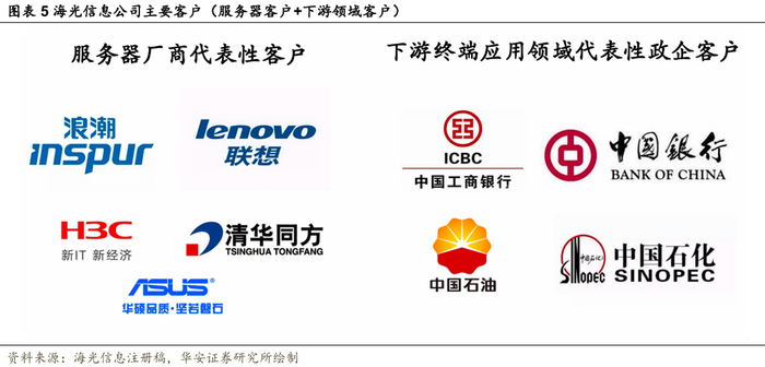 自2018年来,浪潮、联想、新华三、同方等多家国内知名服务器厂商的产品已经搭载了海光CPU芯片,并成功应用到工商银行、中国银行等金融领域客户,中国石油、中国石化等能源化工领域客户,并在电信运营商的数据中心类业务中得到了广泛使用。