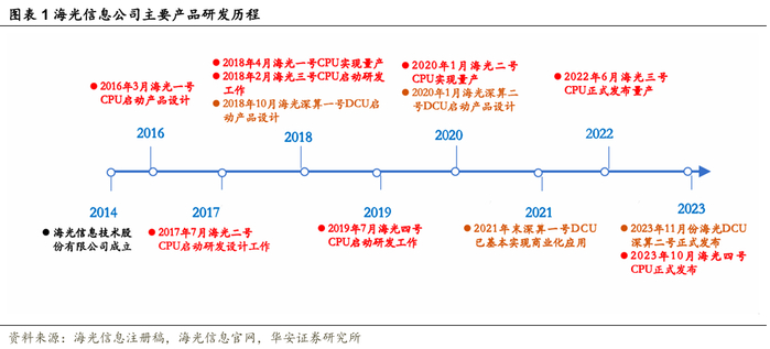 海光CPU演变历程:公司产品2016年3月在基于AMD授权技术基础上启动海光一号CPU的产品设计;2018年4月海光一号实现量产;2017年7月,公司在海光一号的基础上对Core微结构进行优化,提升处理器核心性能和安全应用性能,启动第二代CPU海光二号的产品研发工作;2020年1月海光二号实现量产;2018年2月公司在海光二号CPU的基础上,对核心和片上网络微结构进行设计优化,基于新的工艺节点进行设计,启动了第三代CPU产品海光三号的研发工作,2022年第三代CPU实现小批量出货并于2023年成为公司CPU主力销售型号;2019年7月公司启动了第四代CPU产品海光四号的研发工作,并于2023年10月发布海光四号产品。