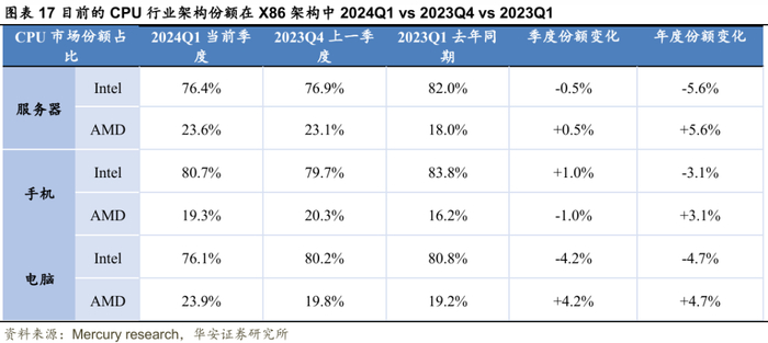 Intel是X86生态的绝对领导者,AMD近年来抢占一定份额。根据Mercury Research的数据统计,在服务器x86CPU中,截止2024Q1,Intel的X86架构占据市场的76.4%,AMD的X86占据市场的23.6%;在手机CPU市场中,Intel的X86架构占据80.7%,AMD的X86占据市场的19.3%;在笔记本电脑和台式机CPU的X86架构中,Intel的X86占据市场的76.1%,AMD的X86占据市场的23.9%。