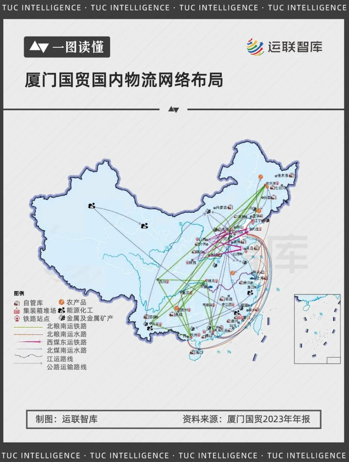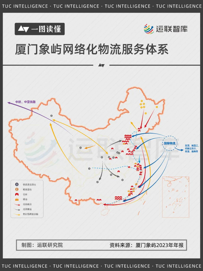 象屿目前拥有三大物流运营主体(象屿速传、象道物流、象屿农产),构建了以“公、铁、水、仓”为核心、链接海内外市场的网络化物流服务体系,包括铁路运输网络、公路运输网络、水路运输网络、仓储集群,以及链接海外市场的国际租船、国际班列等物流通道。