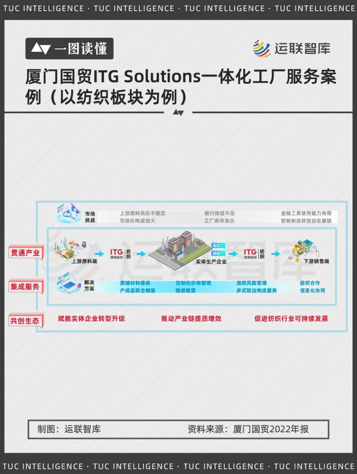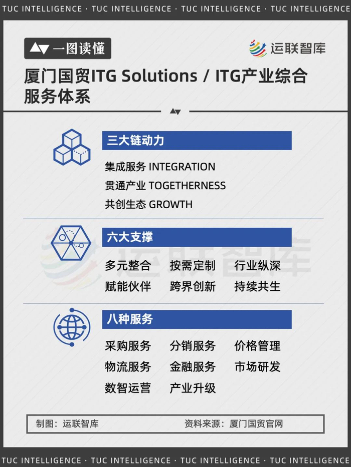 “ITG Solutions”被称为国贸股份“三大链动力”,“I”即集成服务(Integration);“T”即贯通产业(Togetherness);“G”即共创生态(Growth)。厦门国贸从全产业链运营的视角,提供定制化、一体化供应链服务解决方案。