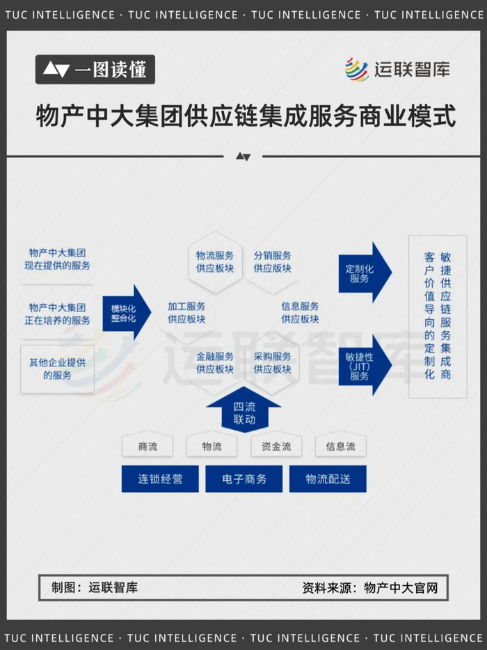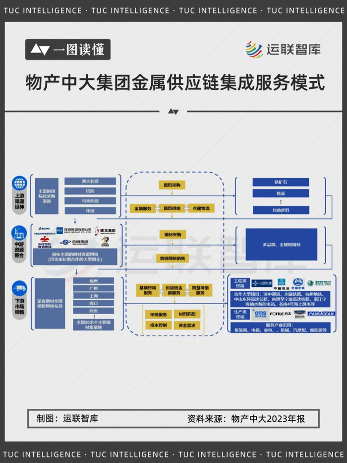 物产中大供应链集成服务,主要依托其资源组织、网络渠道、品牌运营等专业优势,通过集购分销、配供配送、增值服务、期现结合、“大平台+小前端”等集成化平台化运营模式,联动商流、物流、资金流、信息流,为上下游供应链的合作业务伙伴提供原材料采购、加工、分销、出口、物流、金融、信息等高效率的供应链集成服务,致力于成为客户价值导向的定制化敏捷供应链服务集成商。