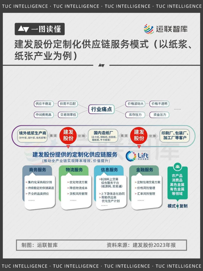 建发股份与境外多个国家的优质纸浆供应商深度合作,实现从上游纸浆资源端到中游国内造纸厂的集约化采购和分销,既服务于纸浆厂的销售需求,又服务于造纸厂对原材料的采购需求,同时辅以物流服务、库存管理、信息服务等供应链综合服务。
