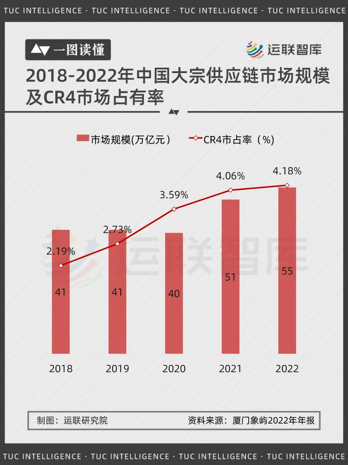 对应的中国大宗供应链CR4市场占有率,由2018年的2.19%快速提升至2022年的4.18%。