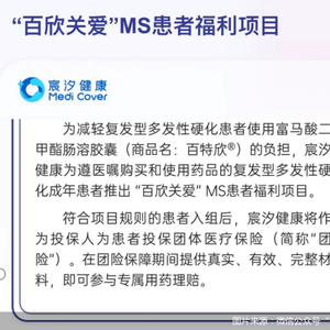 “为减轻复发型多发性硬化患者负担,宸汐健康为遵医嘱购买和使用药品的复发型多发性硬化成年患者推出‘百欣关爱’MS患者福利项目。”上述“百欣关爱”项目介绍,符合项目规则的患者入组后,宸汐健康将作为投保人为患者投保团体医疗保险。在团险保障期间提供真实、有效、完整材料,即可参与专属用药理赔。