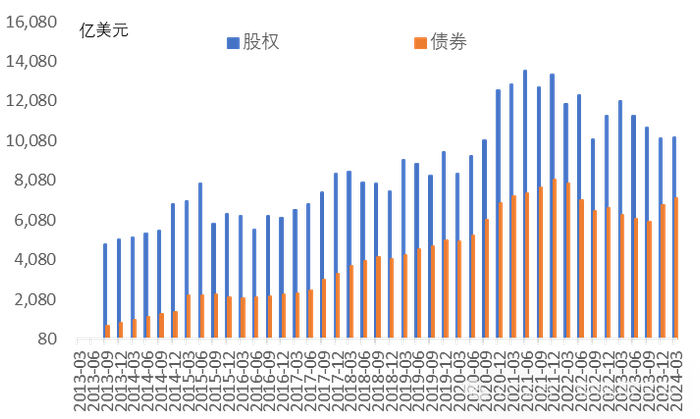 股票类项目部分实现可兑换,境外企业在境内交易所发行以人民币计价的股票仍未实现突破,沪港通、深港通渠道是境内外双向投资参与的重要渠道。截至2024年第一季度,境外机构持有中国市场股票资金流入规模为1.02万亿美元,较去年同期下降1805亿美元。今年1—7月,港股通持续净流入约3843亿元人民币,同比大幅增长211%,在回归季节性水平的基础上创同期历史新高。