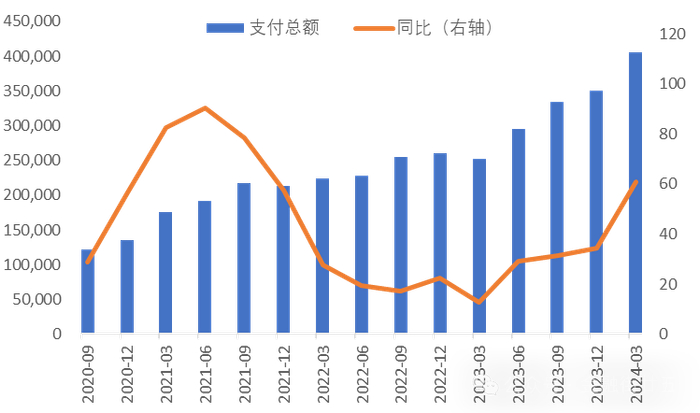 从国内看,根据人民银行公布数据显示,自CIPS建立以来,人民币跨境支付金额持续增长,截至2024年第一季度,规模已超过40万亿元,同比增长60.83%,为历史最高水平。从币种看,人民币在银行对外收付款中的占比稳定在50%以上;与之相对应,美元占比已降至42%,创有记录以来的历史新低。