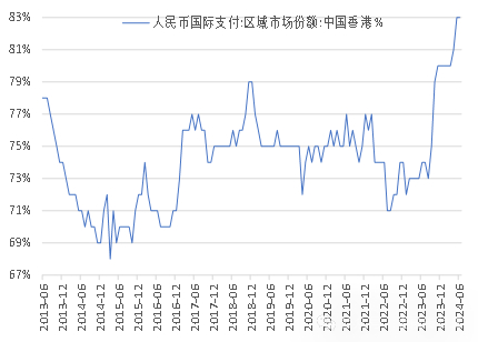 其中,在中国大陆以外,人民币主要以离岸人民币(CNH)形式流通,2024年上半年中国香港地区仍为CNH流通的主要地区,且占全部CNH国际支付份额明显大幅提升,占比已基本稳定在80%以上,并触及83%的历史最高。除香港以外的其他地区占比均有所下滑,但日本排名较2023年底有明显提升,由第10位上升至第7位。此外,由于欧美国家对俄罗斯实施的金融制裁,俄罗斯与SWIFT系统断开,自2023年10月起,CNH流通的地区统计不再包含俄罗斯,而此前,俄罗斯已超越法国成为排名第五的国家(地区)。