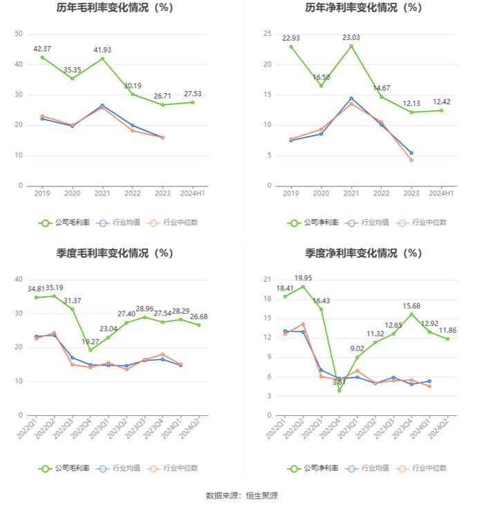 2024年上半年,公司毛利率为27.53%,同比上升2.42个百分点;净利率为12.42%,较上年同期上升2.31个百分点。从单季度指标来看,2024年第二季度公司毛利率为26.68%,同比下降0.72个百分点,环比下降1.61个百分点;净利率为11.86%,较上年同期上升0.54个百分点,较上一季度下降1.06个百分点。