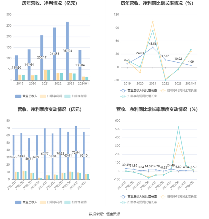 根据半年报,公司第二季度实现营业总收入65.1亿元,同比增长3.59%,环比下降10.75%;归母净利润7.7亿元,同比增长12.85%,环比下降19.00%;扣非净利润7.5亿元,同比增长16.71%,环比下降18.88%。