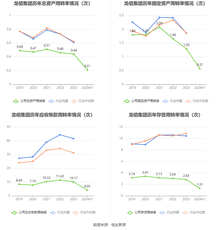 营运能力方面,2024年上半年,公司公司总资产周转率为0.21次,上年同期为0.22次(2023年上半年行业平均值为0.30次,公司位居同行业47/61);固定资产周转率为0.57次,上年同期为0.71次(2023年上半年行业平均值为1.00次,公司位居同行业46/61);公司应收账款周转率、存货周转率分别为4.05次、1.31次。