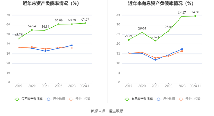在偿债能力方面,公司2024年上半年末资产负债率为61.67%,相比上年末上升0.88个百分点;有息资产负债率为34.58%,相比上年末上升0.21个百分点。