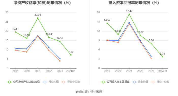 数据显示,2024年上半年公司加权平均净资产收益率为7.19%,较上年同期增长1.45个百分点;公司2024年上半年投入资本回报率为3.74%,较上年同期增长0.25个百分点。