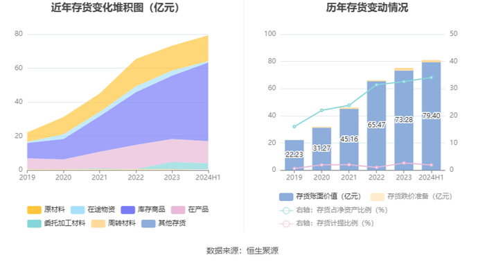 从存货变动来看,截至2024年上半年末,公司存货账面价值为79.4亿元,占净资产的34.11%,较上年末增加6.12亿元。其中,存货跌价准备为1.59亿元,计提比例为1.96%。