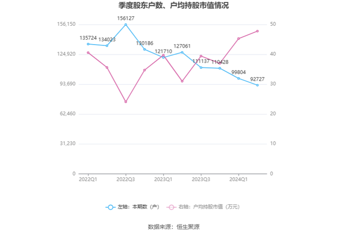 筹码集中度方面,截至2024年上半年末,公司股东总户数为9.27万户,较一季度末下降了7077户,降幅7.09%;户均持股市值由一季度末的45.29万元上升至47.79万元,增幅为5.52%。