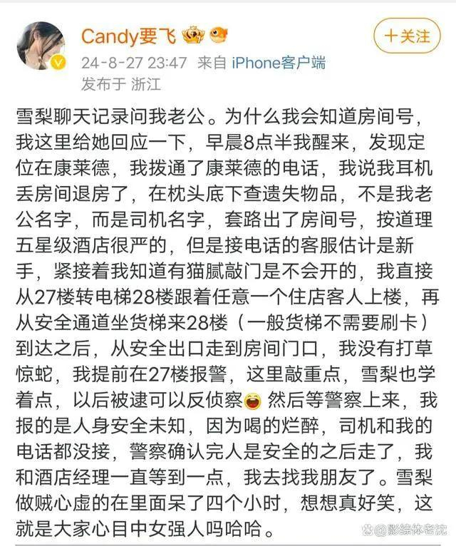 “Candy要飞”在27日晚先发布两条简单信息,分别艾特雪梨及雪梨“丈夫”的小号,内容直指“网红雪梨在8月26日晚于康莱德酒店2818房间吸毒”。