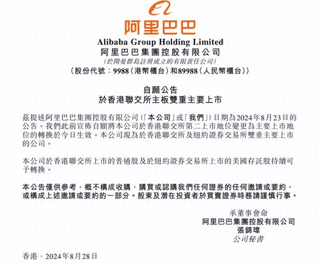阿里巴巴表示,公司一直在为公司在香港主要上市做准备,预计于2024年8月底完成转换。