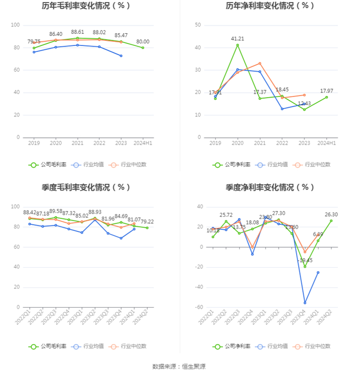 2024年上半年,公司毛利率为80.00%,同比下降7.43个百分点;净利率为17.97%,较上年同期下降7.98个百分点。从单季度指标来看,2024年第二季度公司毛利率为79.22%,同比下降9.71个百分点,环比下降1.85个百分点;净利率为26.30%,较上年同期下降1.00个百分点,较上一季度上升19.91个百分点。